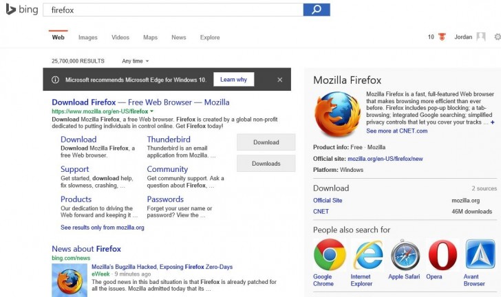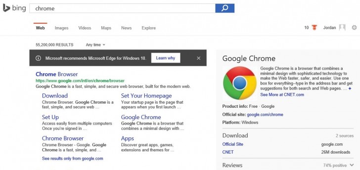 In any case, Microsoft has now hatched a new, slightly more aggressive plot to make you stick with the Edge browser that comes bundled with Windows 10. It appears that the first time you open up the browser and use Microsoft's own Bing search, which is unsurprisingly also set as a default and look up "Chrome" or "Firefox", the results come up along with a quite serious looking gray information strip, explaining that Microsoft Edge is the recommended choice on Windows 10.